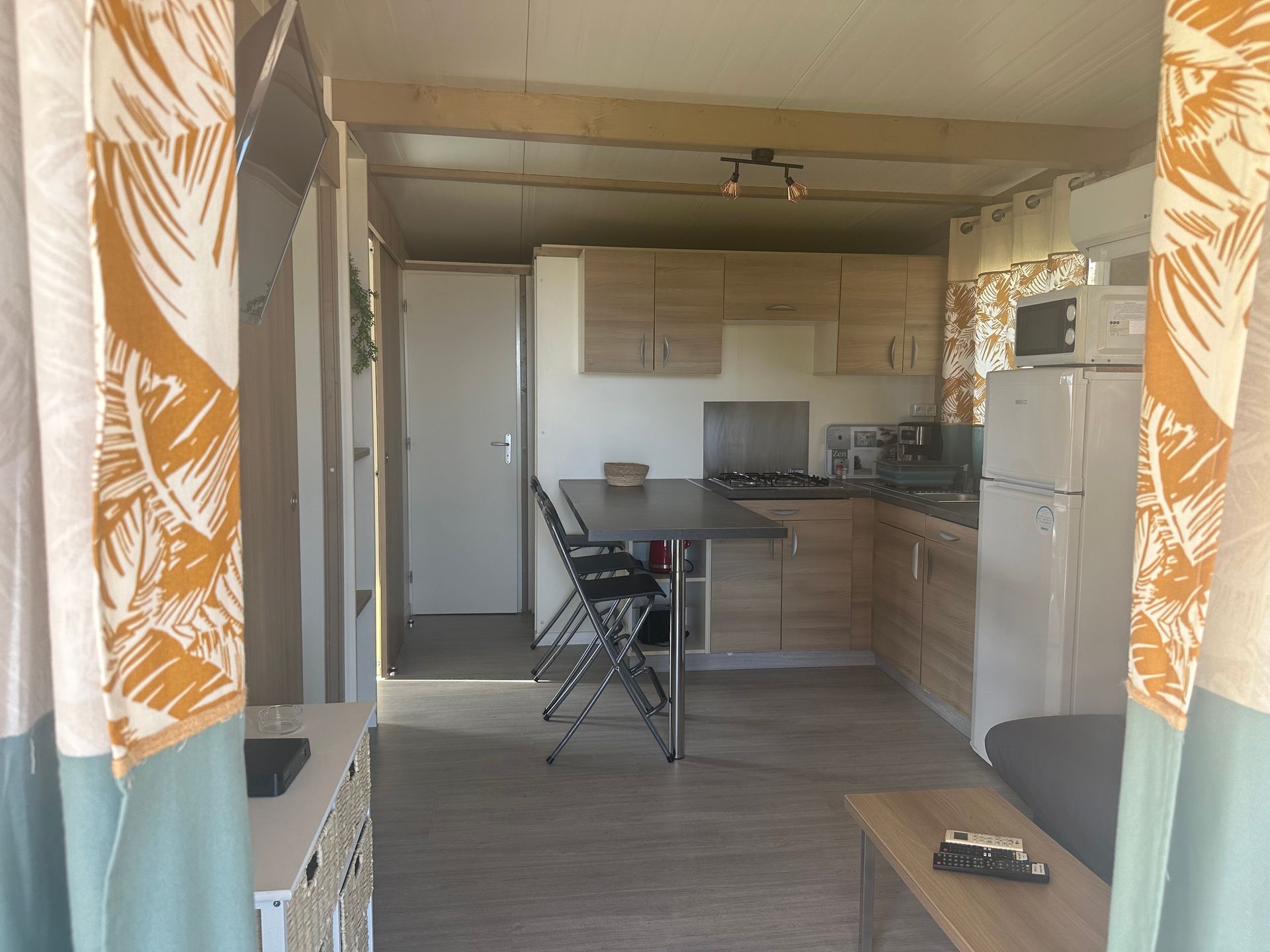 - une kitchenette équipée : micro-ondes, vaisselle, grille-pain et cafetière ;